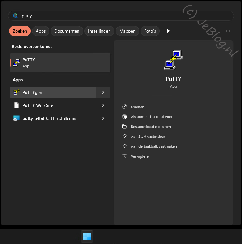Klik op de startknop onder in de menubalk en vul dan in het zoekvenster de tekst ‘putty’ in. Als het goed is zie je dan het programma PuTTYgen in de resultaten staan.