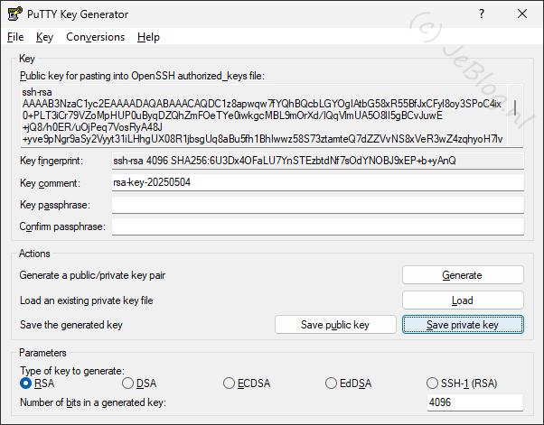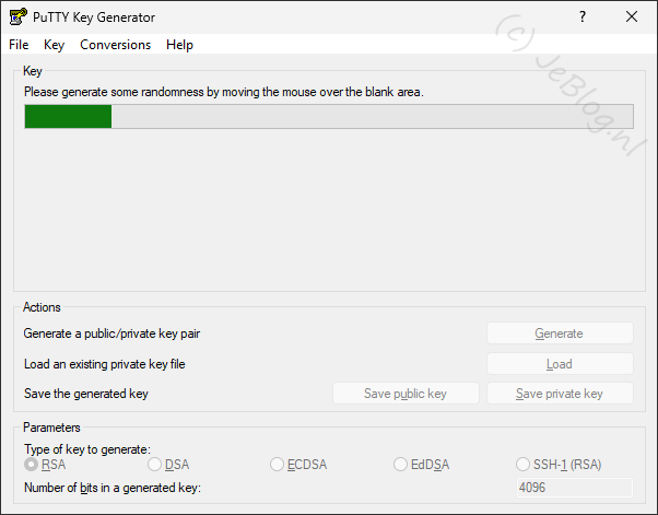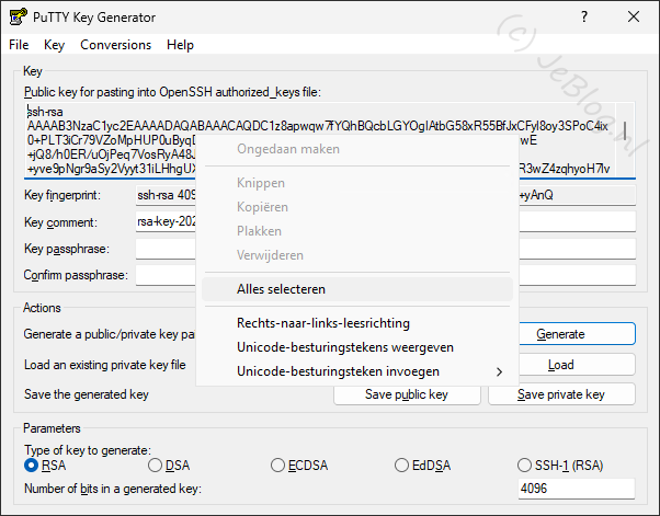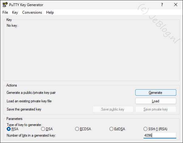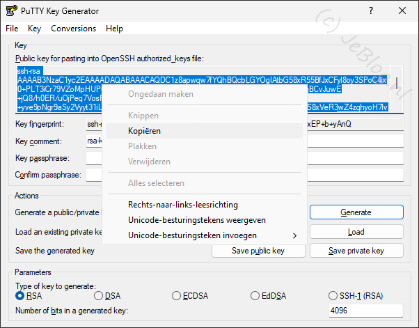 In het PuTTY Key Generator scherm wat nu in beeld komt wijzig je recht onder de waarde van 2028 naar 4096. Hiermee verdubbelen we het aantal bits van de sleutel en deze wordt daarmee sterker.