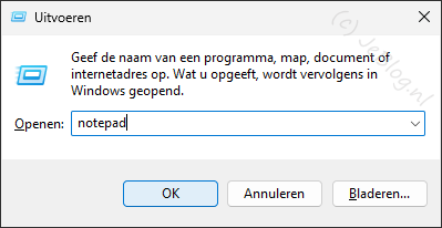 Vul in het scherm van Uitvoeren de tekst ‘Notepad’ in om het kladblok op te starten.