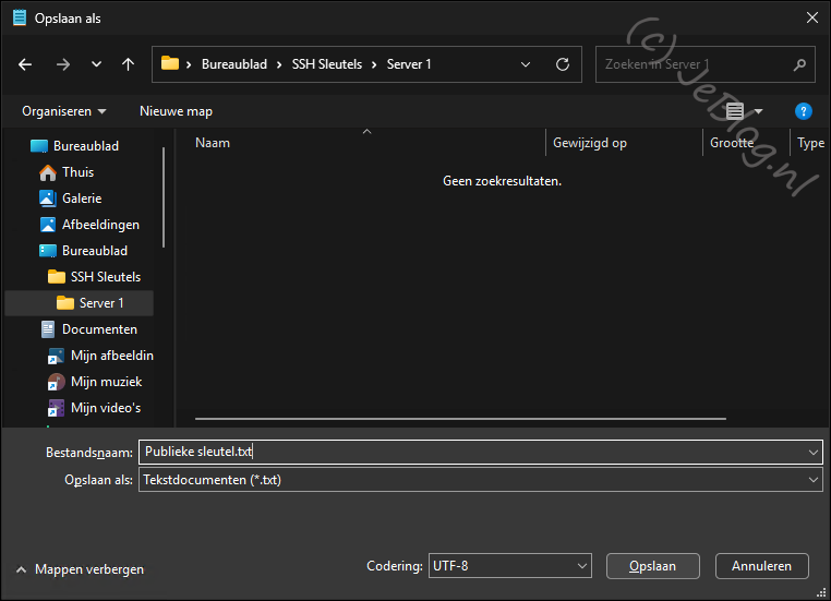 Ik heb in onderstaande afbeelding gekozen om op het bureaublad en map ‘SSH sleutels’ te maken en daarbinnen een map ‘Server 1’.
