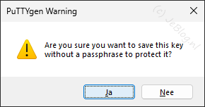 Je krijgt nu de vraag of je de privé sleutel zonder wachtwoord bescherming wil opslaan.