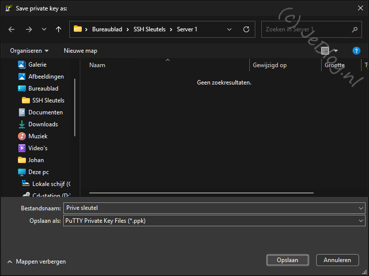 Sla de privé sleutel op in dezelfde map als waar je ook de publieke sleutel hebt opgeslagen en geef het bestand de naam ‘Prive sleutel.ppk’