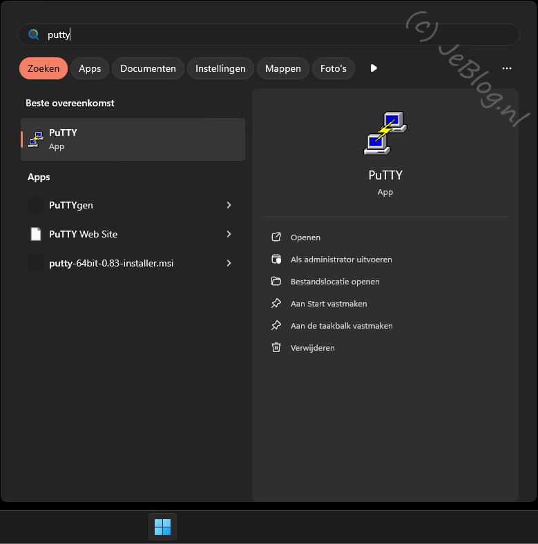 Klik op de startknop onder in de menubalk en vul dan in het zoekvenster de tekst ‘putty’ in. Als het goed is zie je nu het programma PuTTY in de resultaten staan.