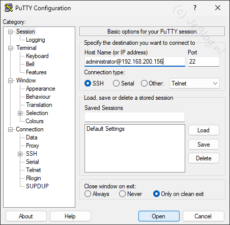 Vul bij ‘Host Name (or IP address)’ nu de naam gevolgd door een @ en daarachter weer het ip adres van je remote Linux machine in (In onderstaande afbeelding is dat ‘administrator@192.168.200.156’).