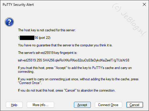 Als je een volgende keer weer verbinding maakt met dezelfde machine mag deze melding niet meer verschijnen. Gebeurt dat wel dan moet je voorzichtig zijn en kun je het beste op de knop ‘Cancel’ klikken en controleren of je inderdaad het juiste IP adres of de juiste naam achter het @ hebt ingevuld!