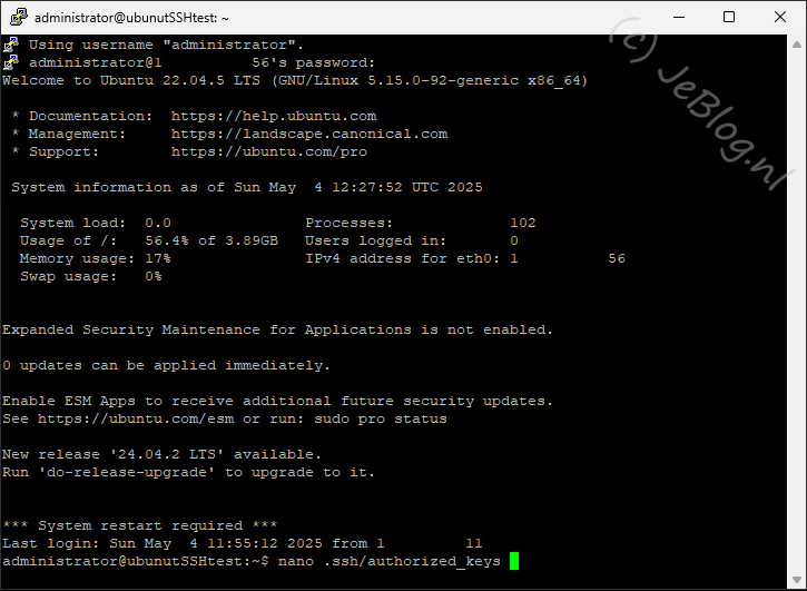 Wanneer alle voorgaande stappen goed zijn uitgevoerd heb je nu zonder wachtwoord maar met het sleutel paar een verbinding gemaakt met de remote machine.