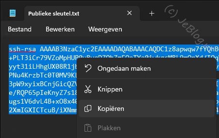 Open de publieke sleutel of maximaliseer het kladblok waarin je dit bestand nog geopend hebt en druk op de toet combinatie CTRL en de letter A om de hele sleutel te selecteren.
