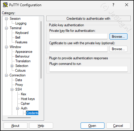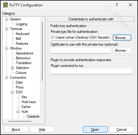 Maar nu gaan we ook de prive sleutel in deze sessie gebruiken en daarvoor ga je aan de linker kant in het menu naar: ‘Connection’ => ‘SSH’ => ‘Auth’ => ‘Cedentials’.