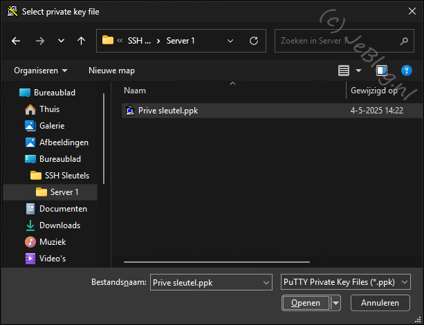 In mijn geval was dat de map ‘Server 1’ in de map ‘SSH Sleutels’ op het bureaublad.